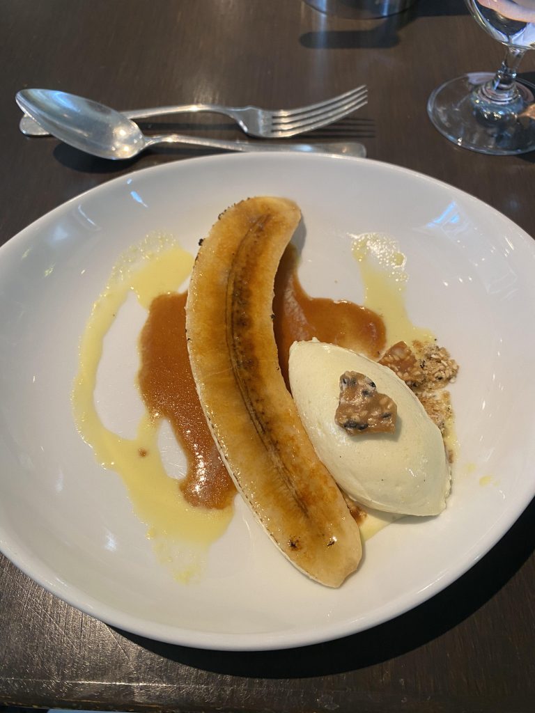 Caramelized Banana with Ginger Ice Cream and Sesame Praline